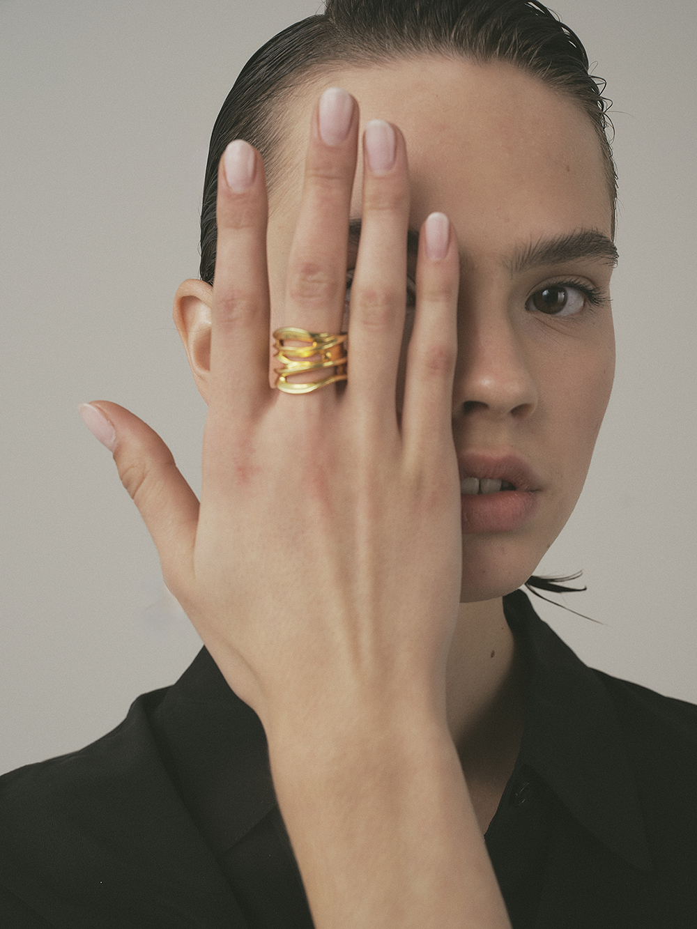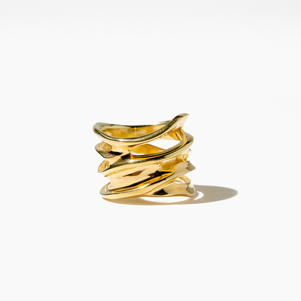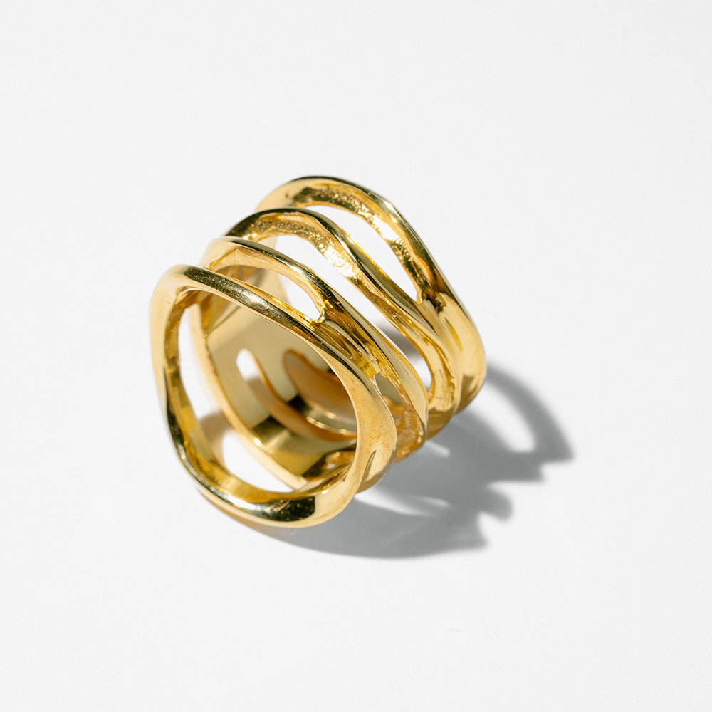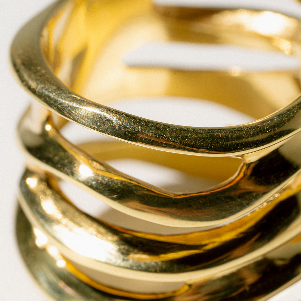 A celebration of inspired thought, Flux is a dynamic dance of wavy rings, crafted in gold-plated recycled sterling silver. Some rings stack closely, rooted in experience, while others float freely, tracing paths of curiosity and imagination. Each undulation captures the rhythm of a mind that draws strength from the grounded and yet soars into the playful unknown. Together, they embody the joy of discovering possibilities where others see obstacles, a reminder that true insight comes from balance — the harmony of steady roots and unbounded flight.