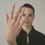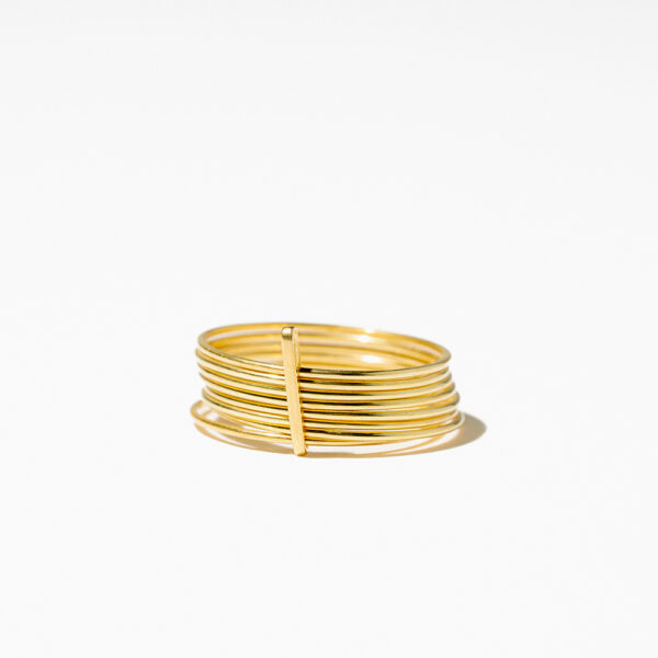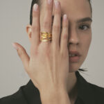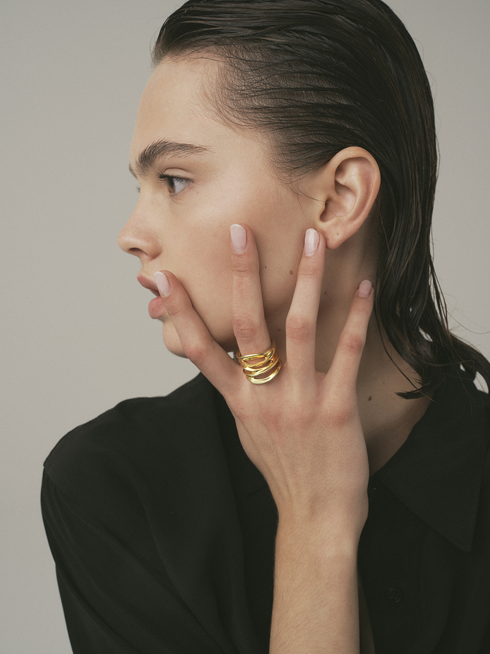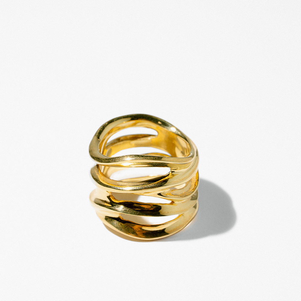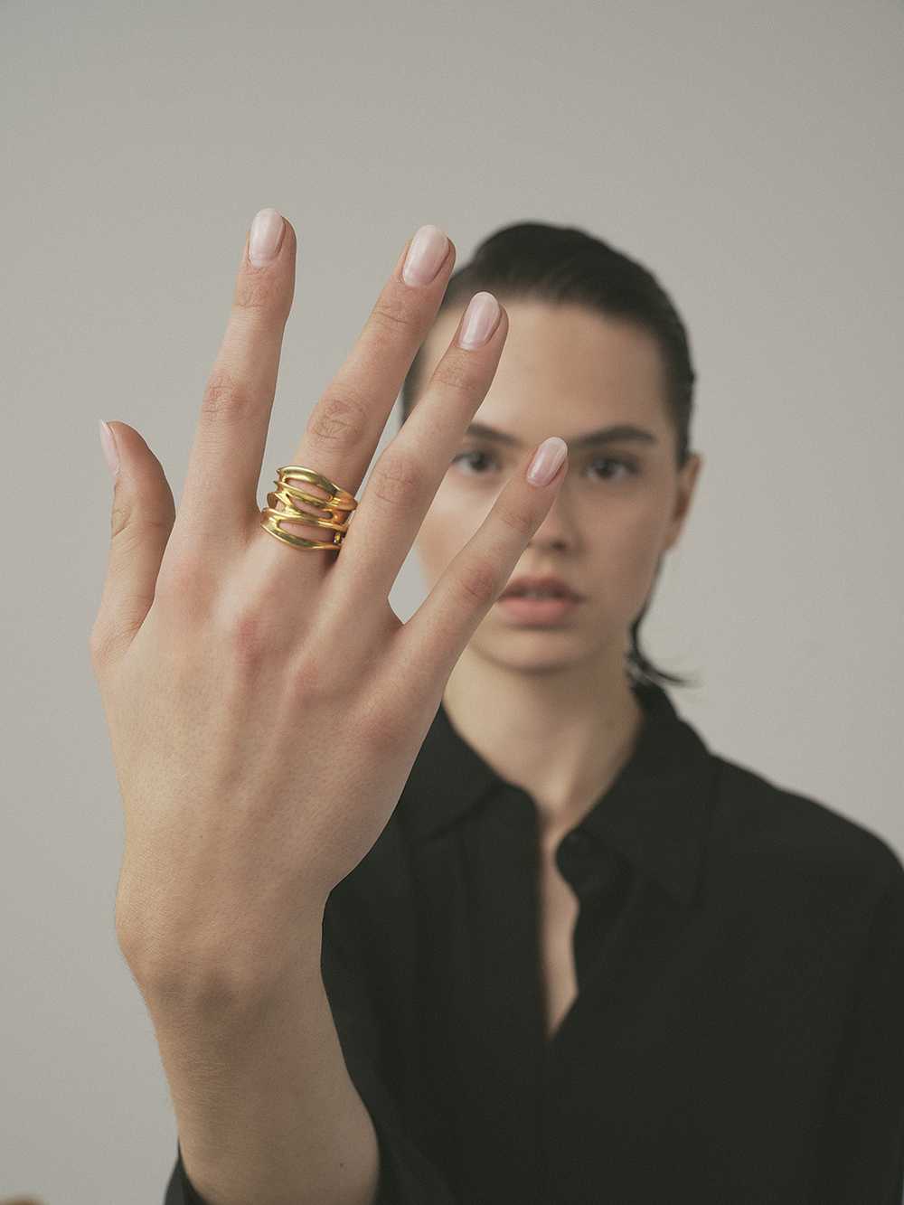 A celebration of inspired thought, Flux is a dynamic dance of wavy rings, crafted in gold-plated recycled sterling silver. Some rings stack closely, rooted in experience, while others float freely, tracing paths of curiosity and imagination. Each undulation captures the rhythm of a mind that draws strength from the grounded and yet soars into the playful unknown. Together, they embody the joy of discovering possibilities where others see obstacles, a reminder that true insight comes from balance — the harmony of steady roots and unbounded flight.