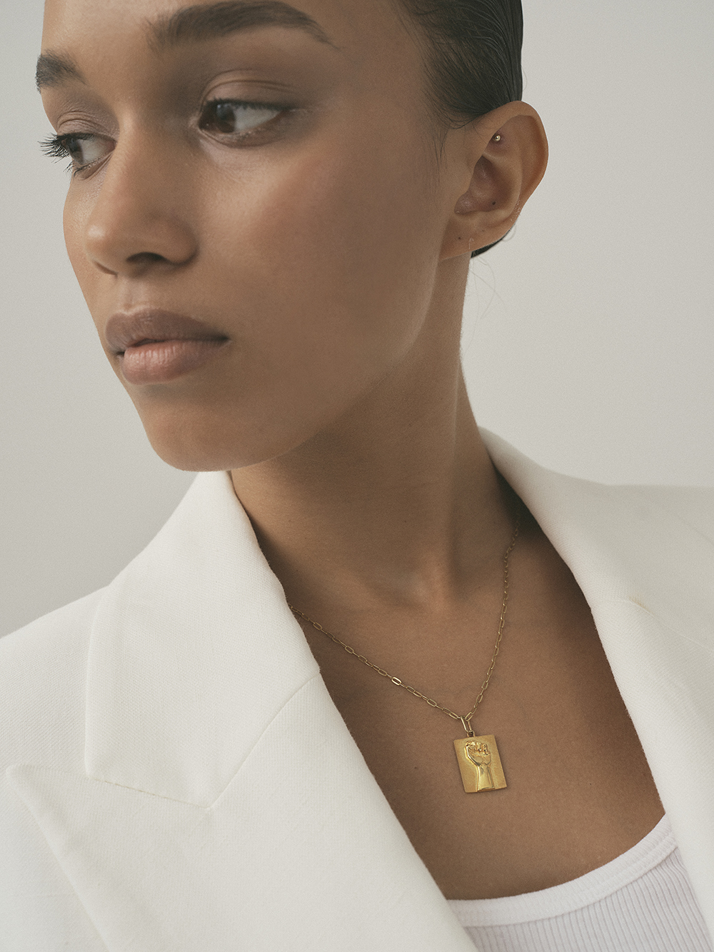 Bold and unshakable, Power channels the courage that rises when voices unite — the kind that turns resistance into change and solidarity into triumph. Available in recycled sterling silver or gold-plated recycled sterling silver, it carries the iconic raised fist: a symbol born from workers’ rights movements and kept alive by every strike, boycott, and fearless stand for justice. Its strong lines gleam like conviction, each polished edge a reminder that strength grows when others stand beside us. Power is more than adornment; it’s a declaration — resilient, unwavering, and fiercely together.