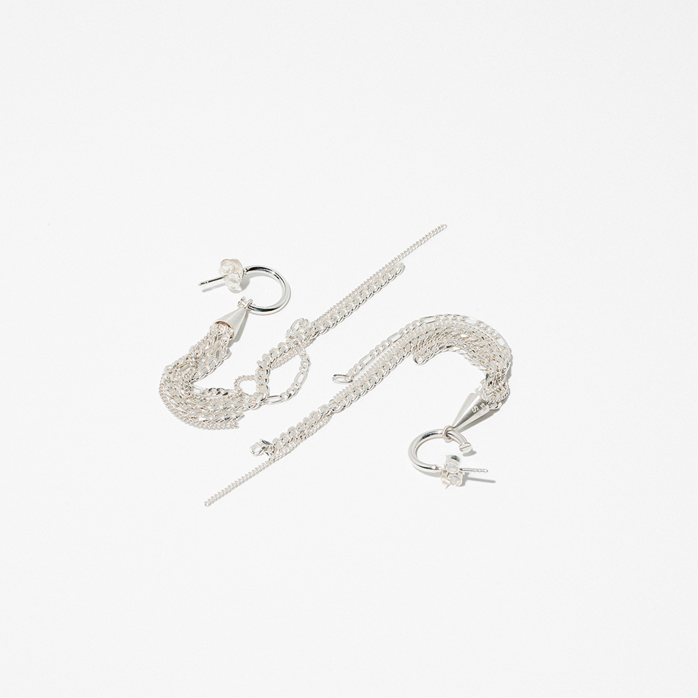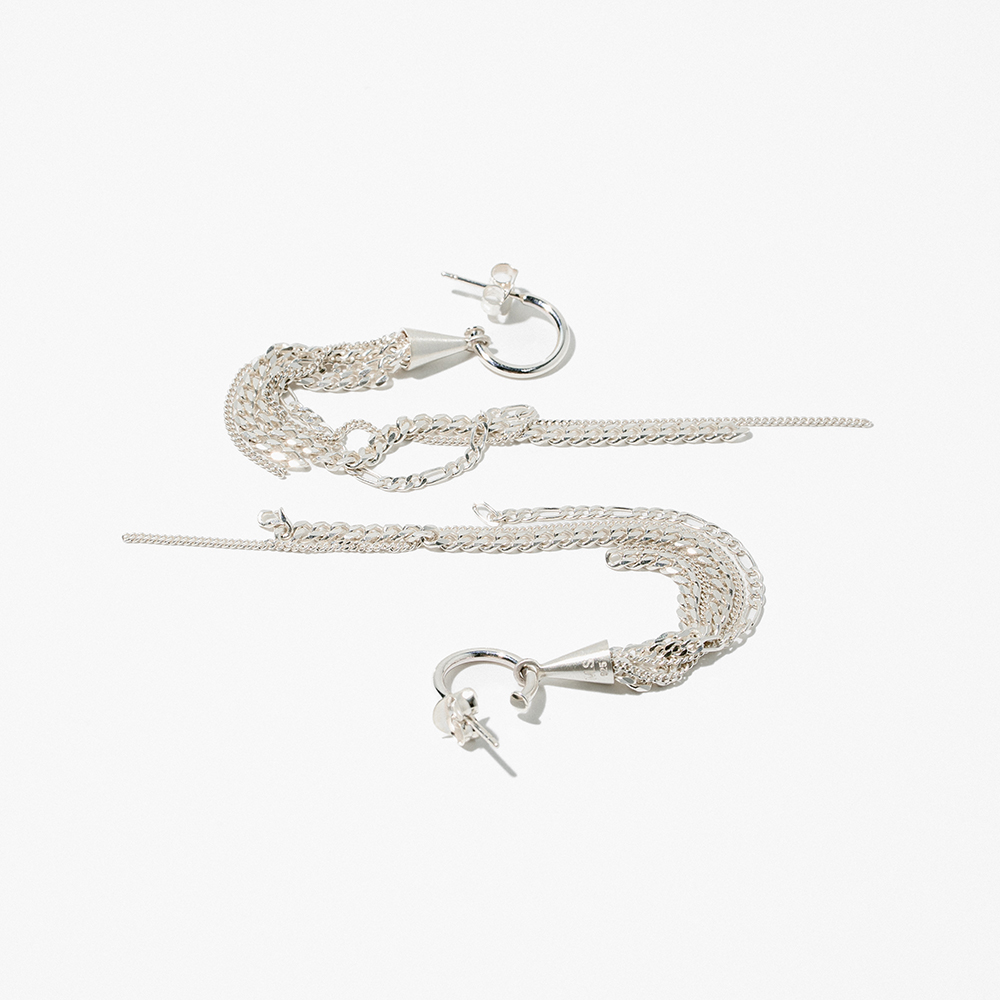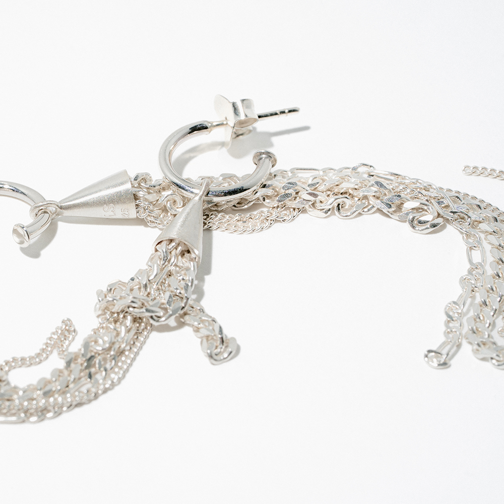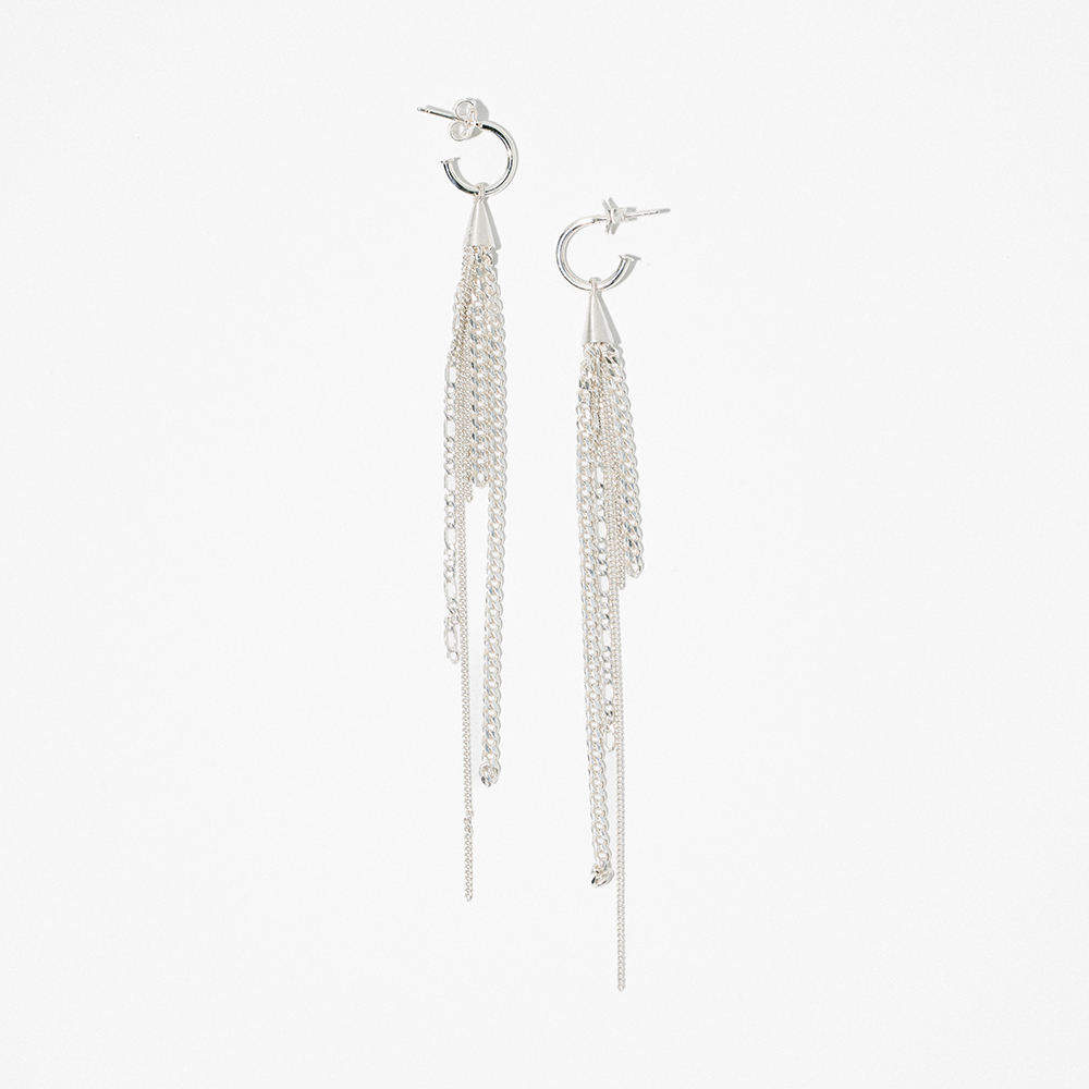 Formed from recycled sterling silver, each earring begins with a gleaming cone from which fine chains unfurl like rays of laughter, swaying and shimmering with every turn.